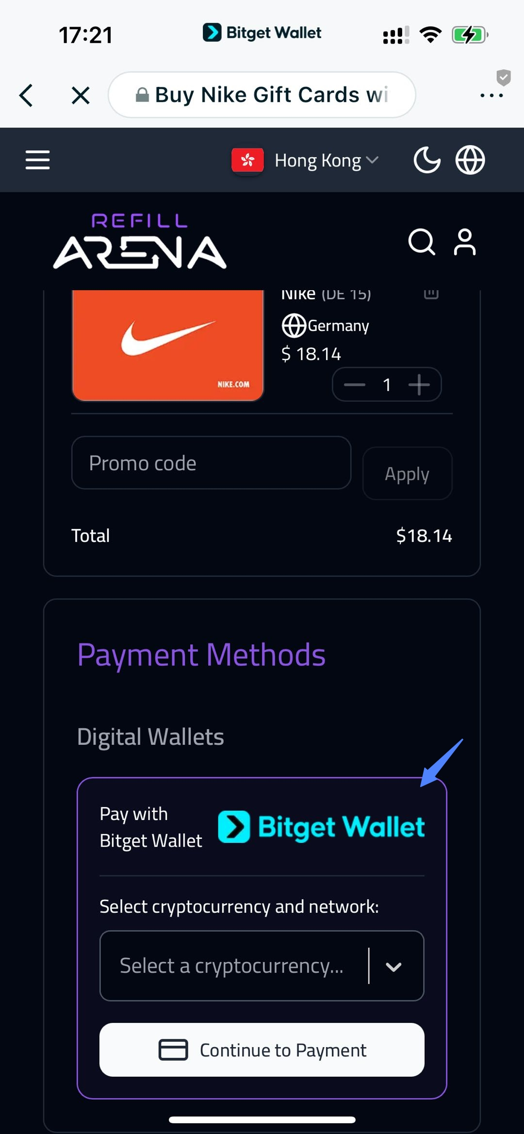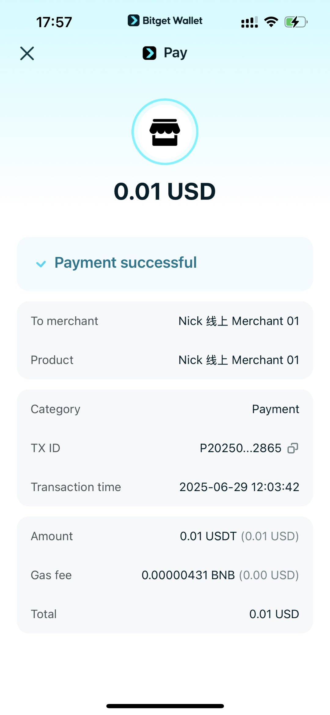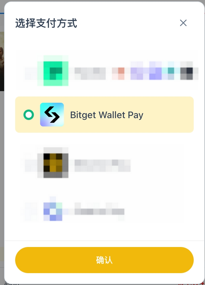 *Bitget Wallet Pay 作为唯一支付方式在 dapp 上下文中不显示其他支付方式